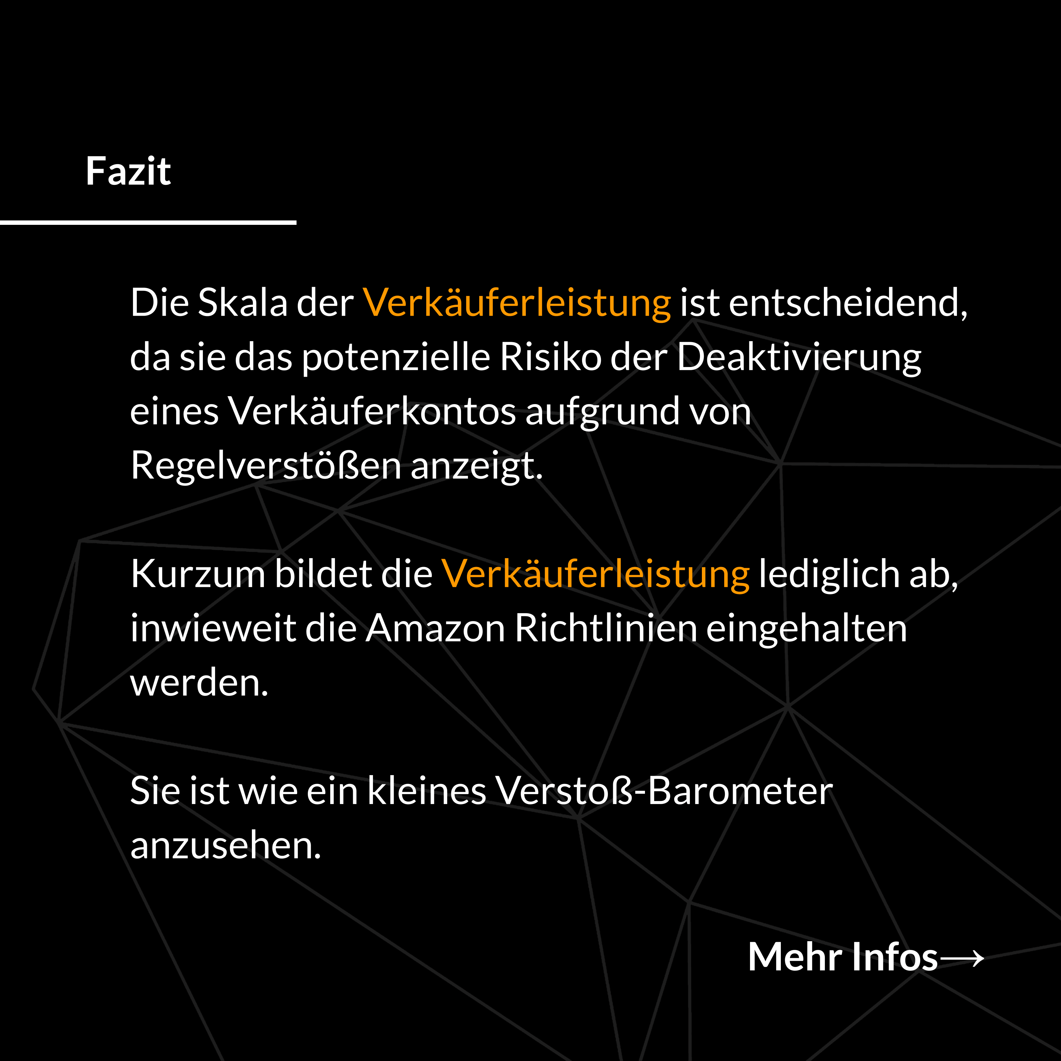Die Skala der Verkäuferleistung ist entscheidend, da sie das potenzielle Risiko der Deaktivierung eines Verkäuferkontos aufgrund von Regelverstößen anzeigt. Sie bildet zusammengefasst ab, inwieweit die Amazon-Richtlinien eingehalten werden, und dient somit als ein Verstoß-Barometer für Verkäufer.